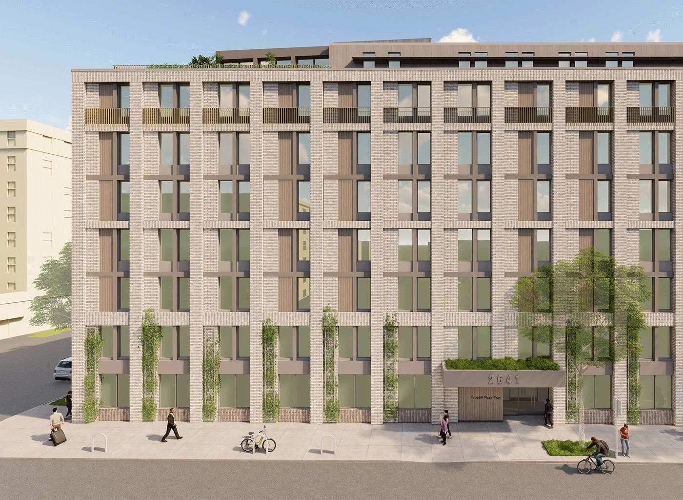 Faircliff Plaza East is located on 14th Street in the Columbia Heights neighborhood of Washington, DC. Our team was able to draw on ECA’s 40 years of affordable housing and green design experience to deliver comfortable, high-quality housing for the District’s most disadvantaged residents. A mix of local, private, and federal funding included requirements for advanced levels of sustainability, which led to the project being designed to meet both Passivehaus and LEED Platinum standards. Although Passivehaus mandates less glass compared to a standard building, our team was able to avoid a “punched window” appearance by designing a thoughtful pattern of projecting brick pilasters and metal mullions, giving the façade a level of complexity and refinement unusual in an affordable development. The building incorporates 125 one, two and three-bedroom deeply affordable units, replacing 80 garden style apartments currently on the site. Those units include replacement units for all former residents, who have been temporarily re-housed until construction is complete. Resident amenities include a community room, rooftop patio, and lush courtyard with children’s playground.