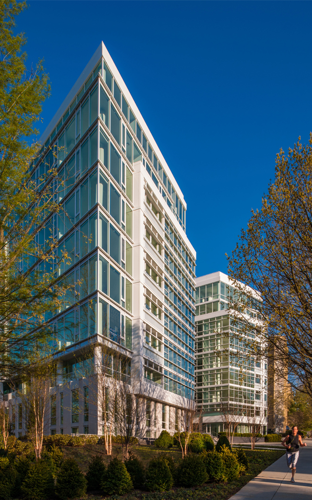 Connecticut Avenue is lined with grand apartment buildings, dating from the late 1800s and early 1900s at the south end and giving way to Art Moderne, Art Deco, and postwar buildings to the north. Our building is the 21st-century culmination of this progression, with layered façades and a high degree of transparency. The angled wings express the relationship between Washington’s orthogonal grid and diagonal avenues. The open nature of the main entry façade provides visual interest and enables views through the lobby to the landscaped courtyard beyond.